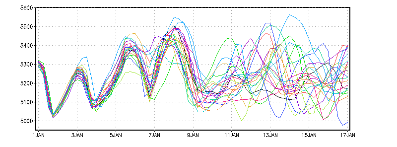 Next, suppose you rerun the same forecast 20 more times, tweaking the initial conditions a little bit for each run -- you've created a 21-member ensemble forecast. All the ensemble members have the same length and start time. A classic technique for illustrating variability among ensemble members is to draw a "spaghetti" plot -- one contour line for each member. The following display shows a spaghetti plot for the same location and vertical level as drawn above, with one line for each ensemble member (16-day forecast of 500mb height at 45N, 60W from 21 ensemble members):