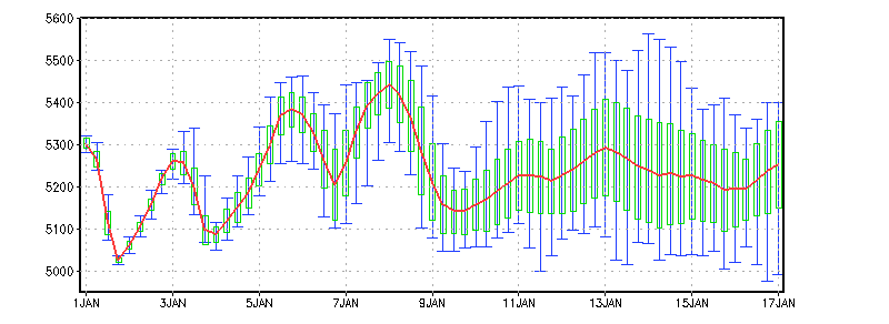Because GrADS handles the ensemble members as a single grid, we can perform some calculations over the ensemble dimension. The GrADS analysis functions operate on E the same way they do on X, Y, Z, and T. Below is yet another version of the same data in the spaghetti plot; this time the display shows the ensemble mean (the red line), the ensemble mean +/- one standard deviation (green bars), and the minimum and maximum values over all members (blue whiskers):